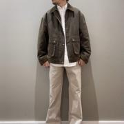 色味を抑え、ジャケットとパンツのシルエットをきれいにまとめると、都会的な印象に。