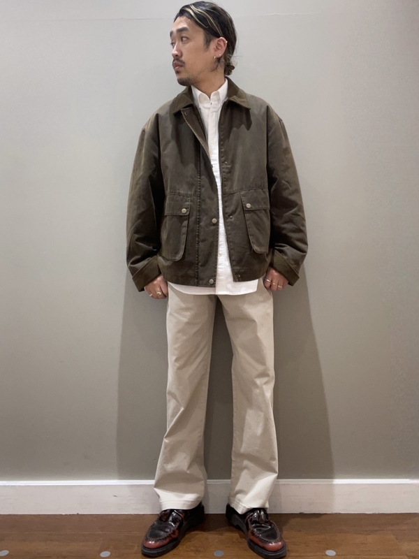 色味を抑え、ジャケットとパンツのシルエットをきれいにまとめると、都会的な印象に。