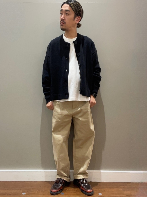 バギーカーキパンツ × セーターの組み合わせは、カジュアルながらも大人っぽく決まる万能コーデ。