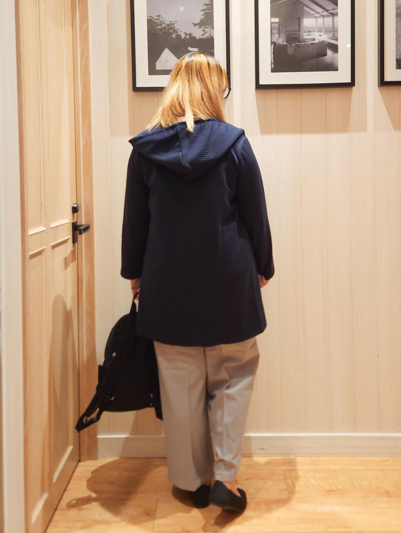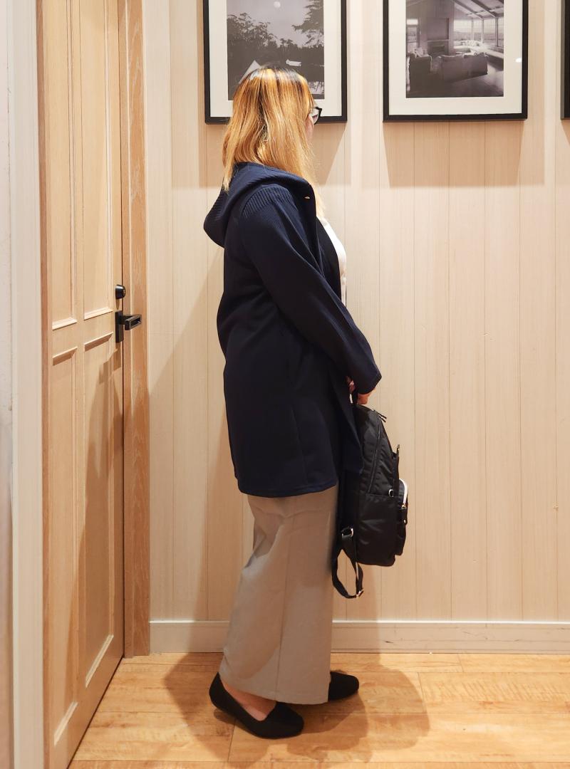 ネイビーのコーディガンに、小物は黒を使ったので、インナーとパンツは明るいカラーにしてメリハリを付けました。
