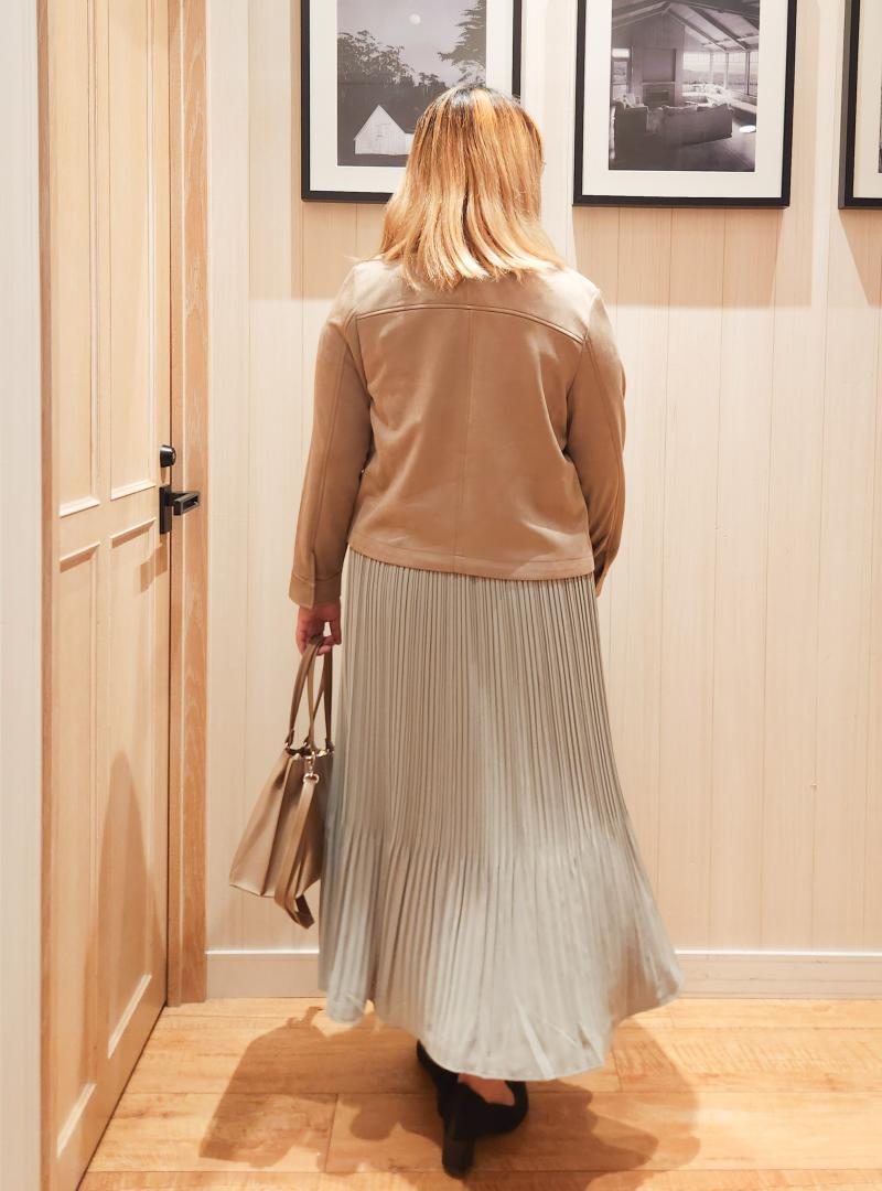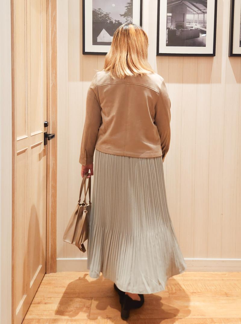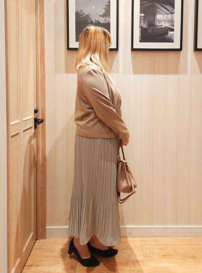 ニットはイン、ジャケットは腰丈、そこにロングスカートで腰の位置を高く見せ、スタイルアップコーデにしました。