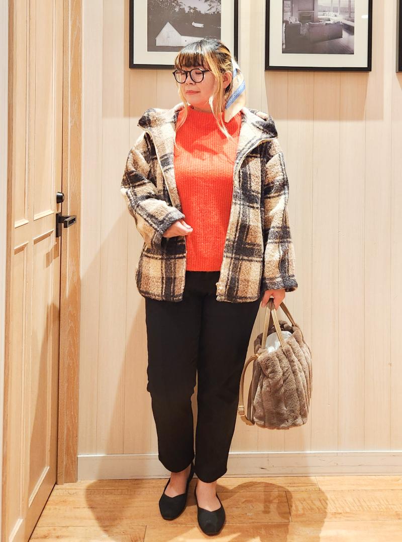 存在感のあるチェックのアウターに、目を引くオレンジのニットで大人カジュアルコーデ。