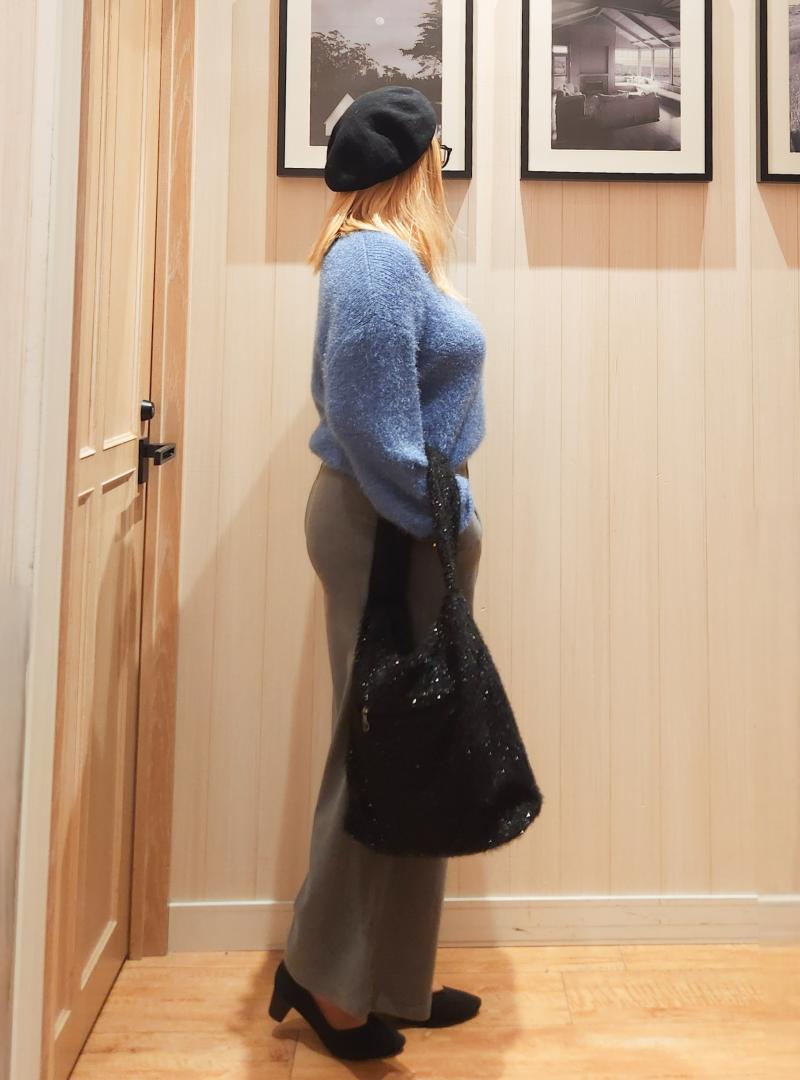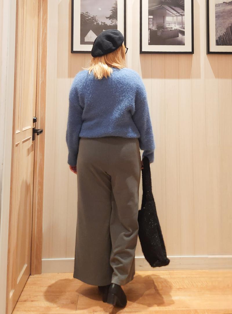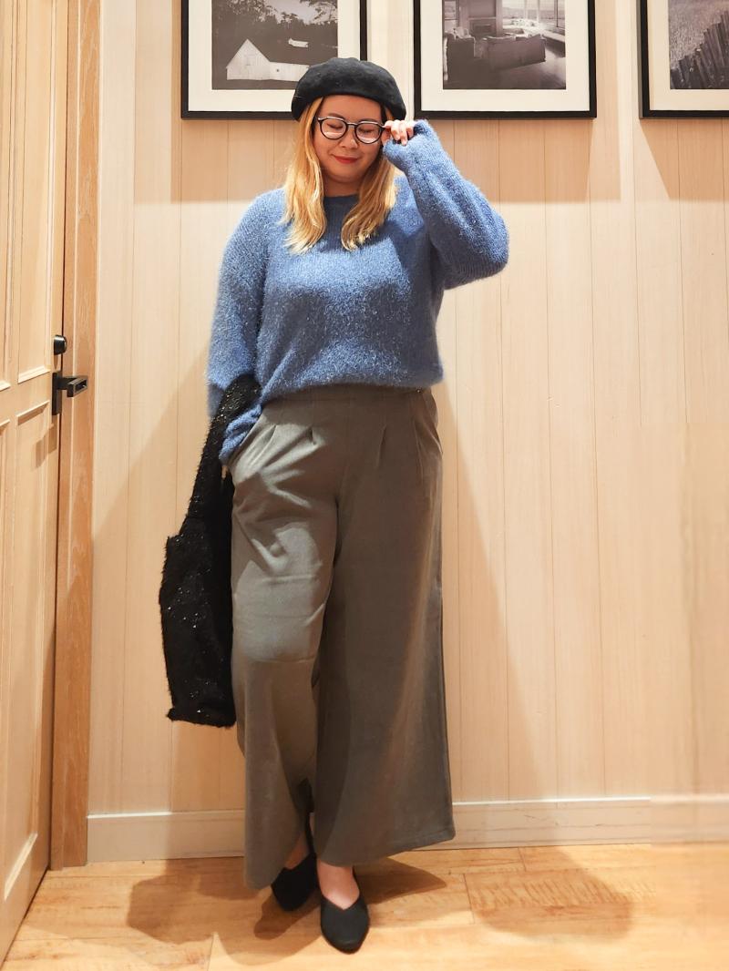 トップス、ボトムスどちらも身体のラインを拾いづらいものを使い、体型カバーしました。