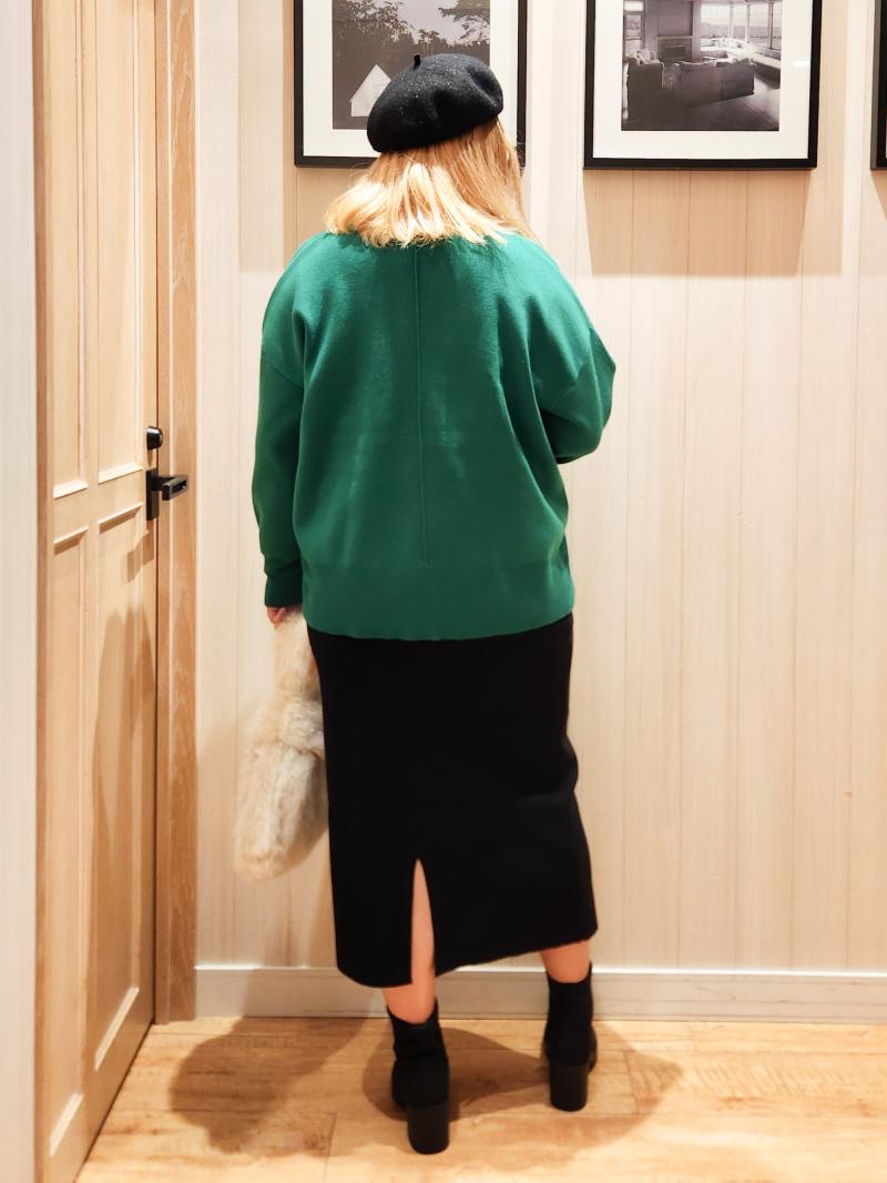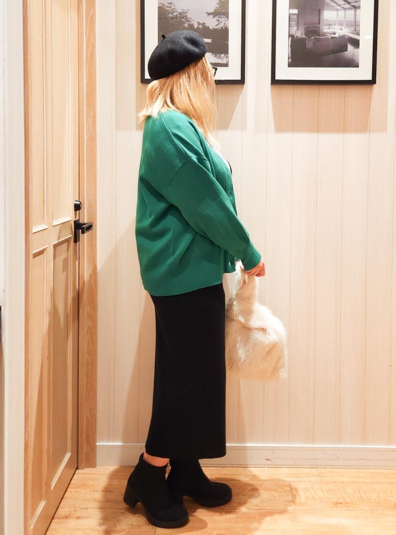 グリーンのカーディガンがアクセントで、他アイテムはモノトーンで揃えました。