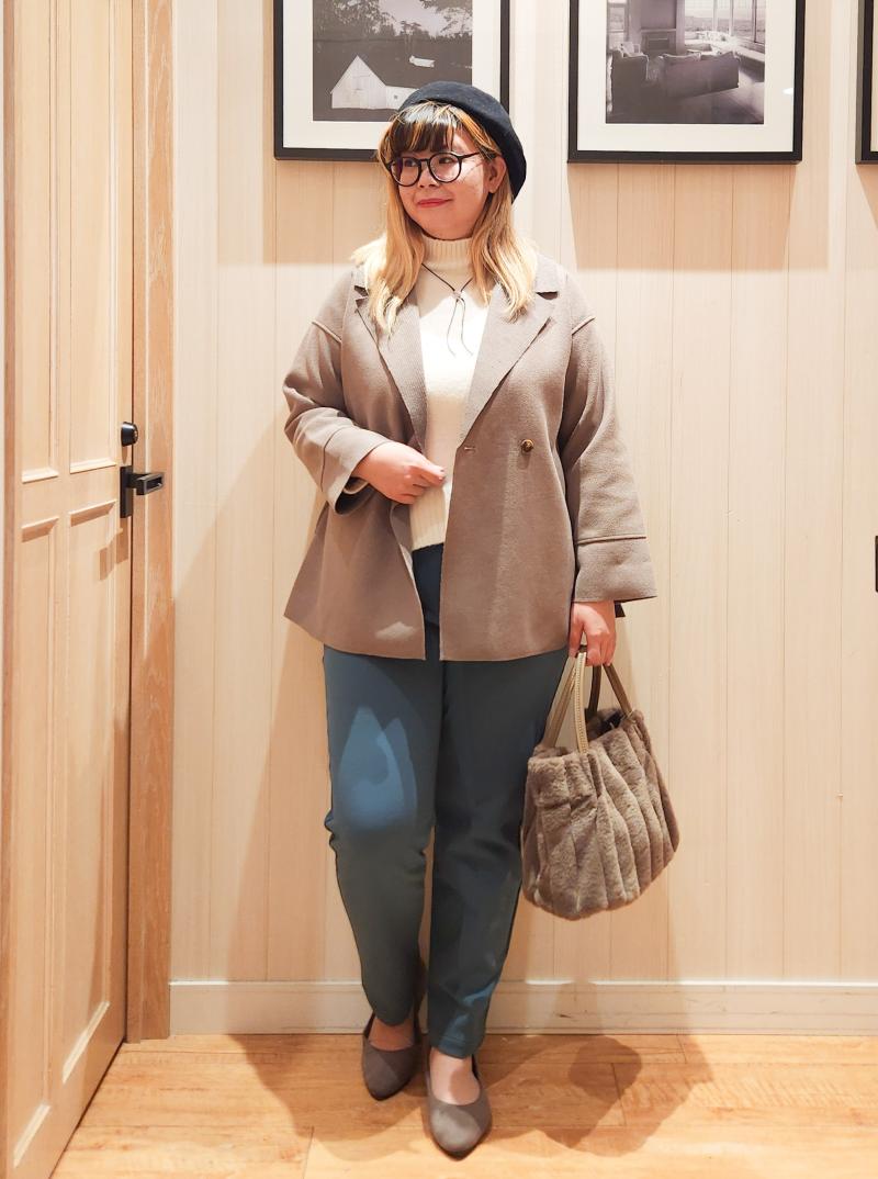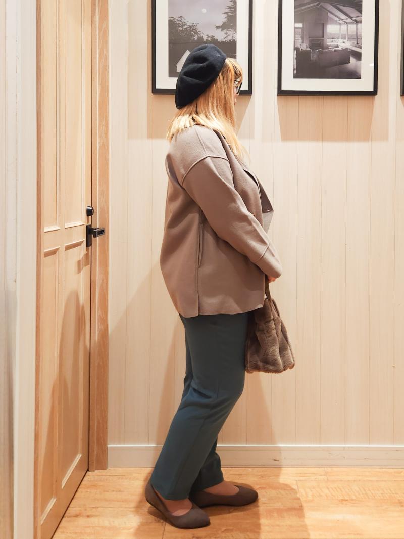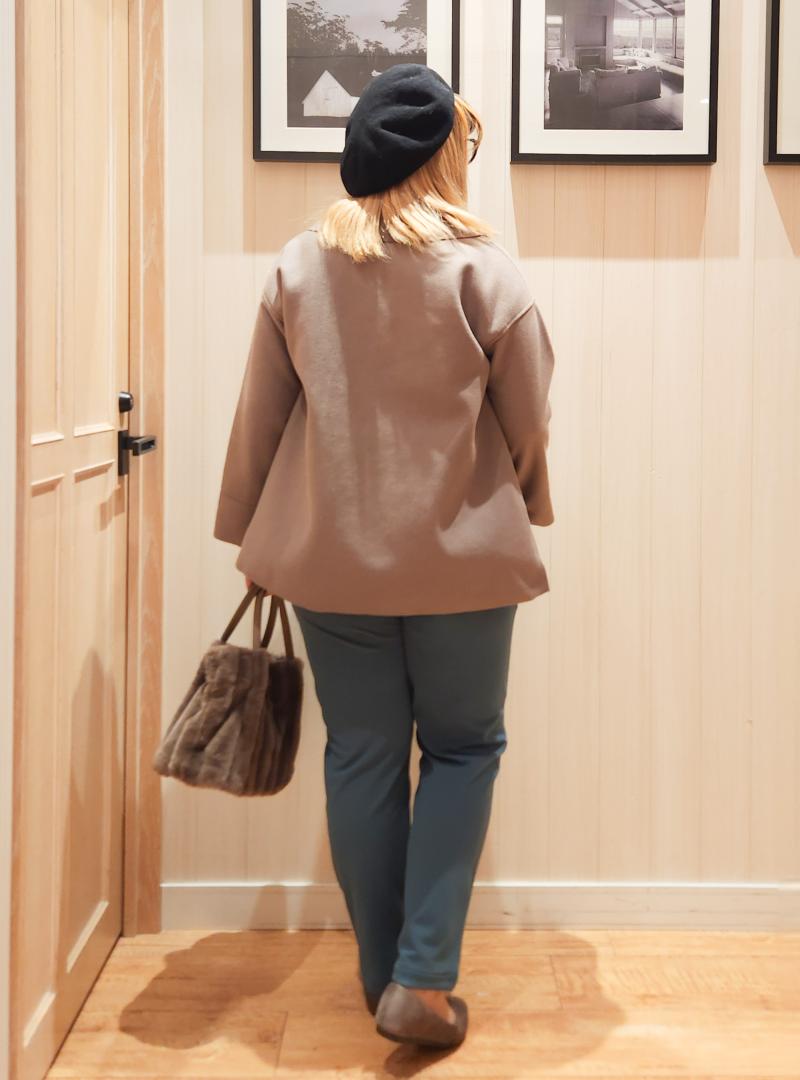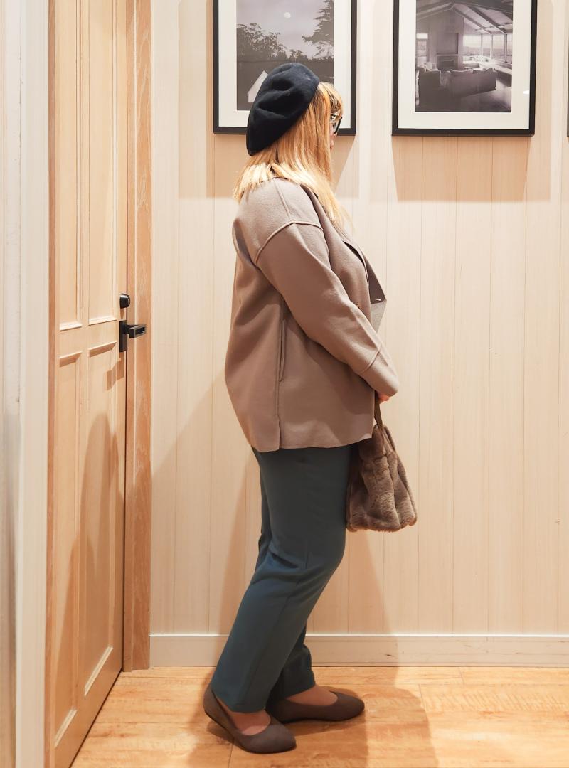 ハリのあるジャケットが上半身に少しボリュームを出したので、ボトムはテーパードパンツでスッキリ見せ。