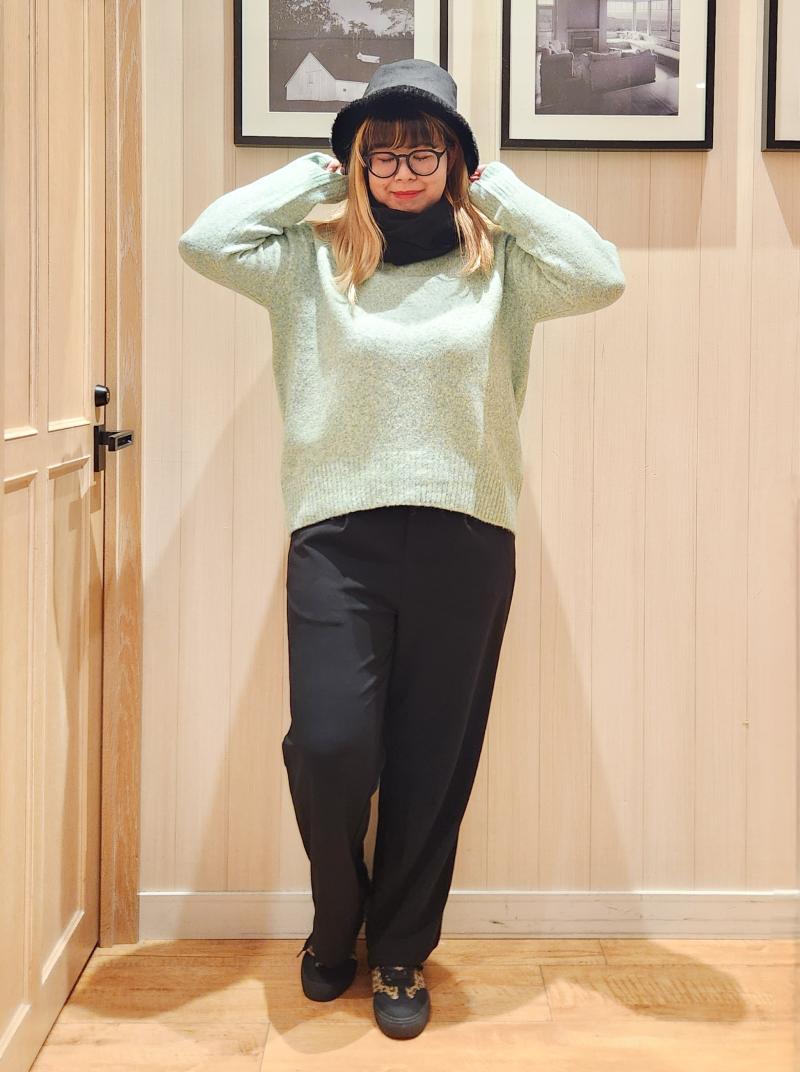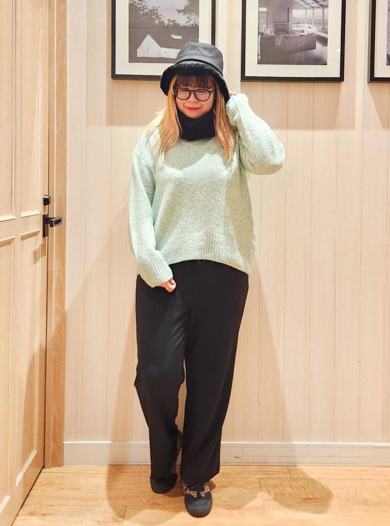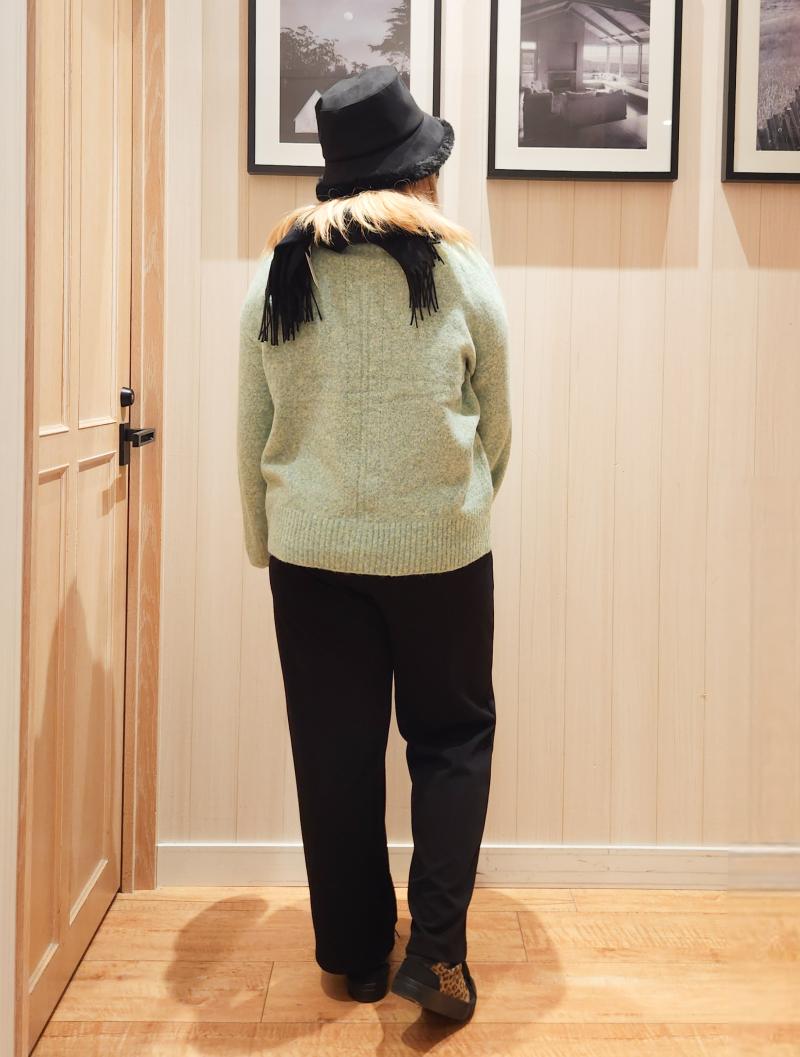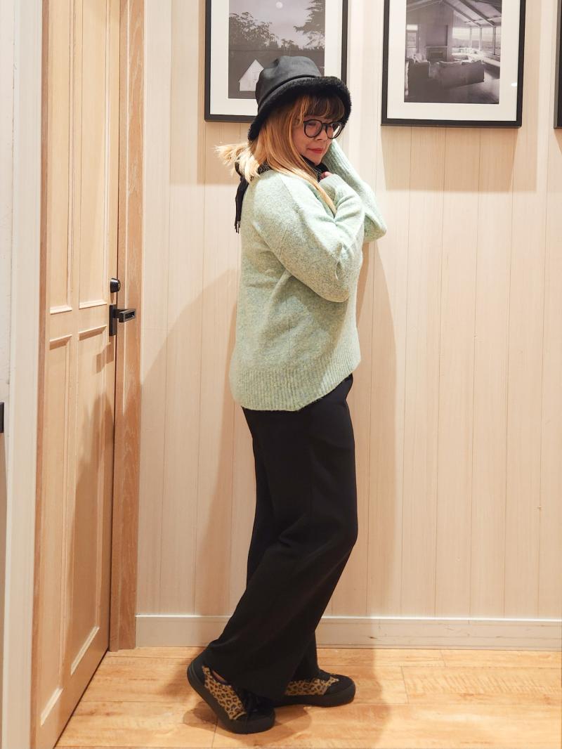 お尻はニットでカバーし、ワイドパンツで腰周りのラインをカバーしてます。