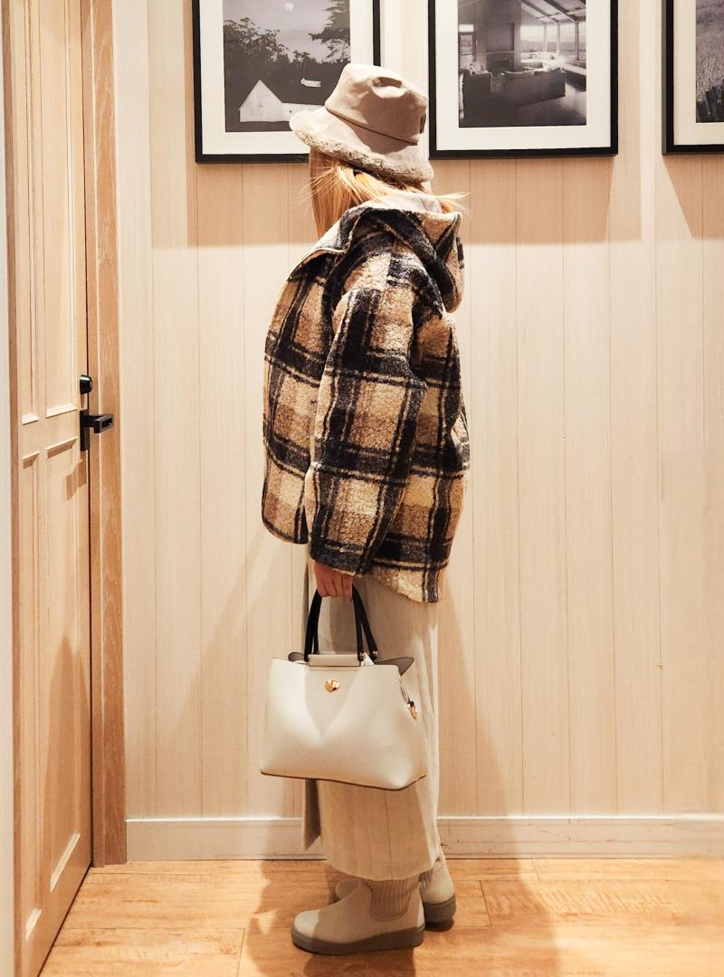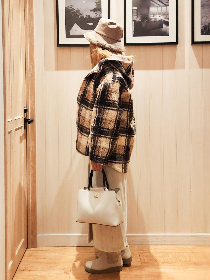 ベージュのコートがアクセントのきれいめカジュアルコーデ。