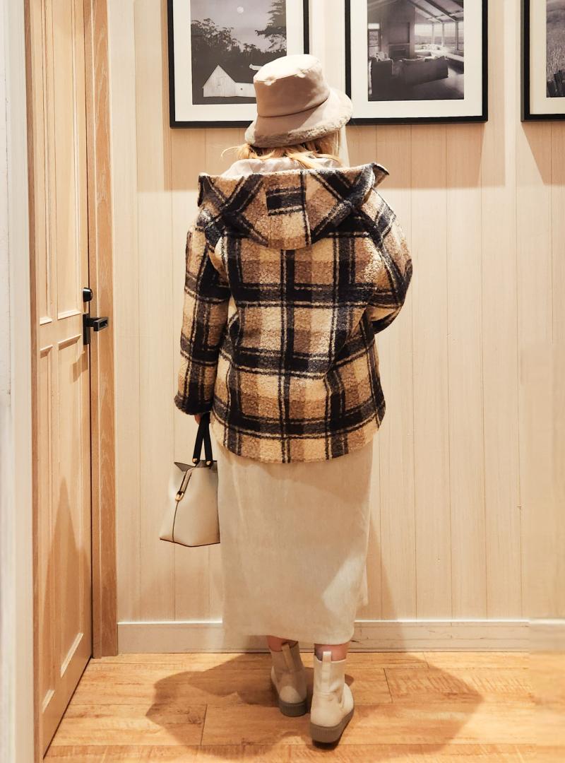 上半身にボリュームがあるので、ボトムはナロースカートでスッキリさせてます。