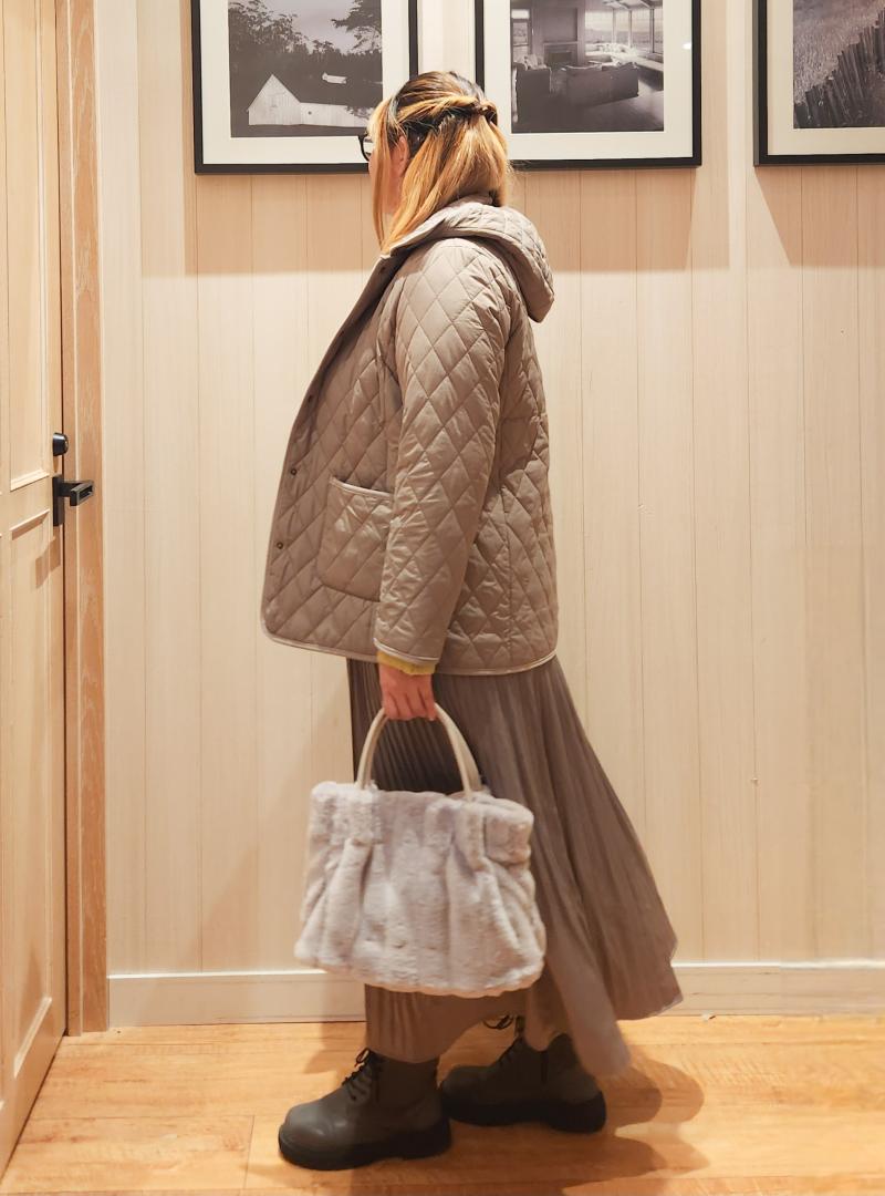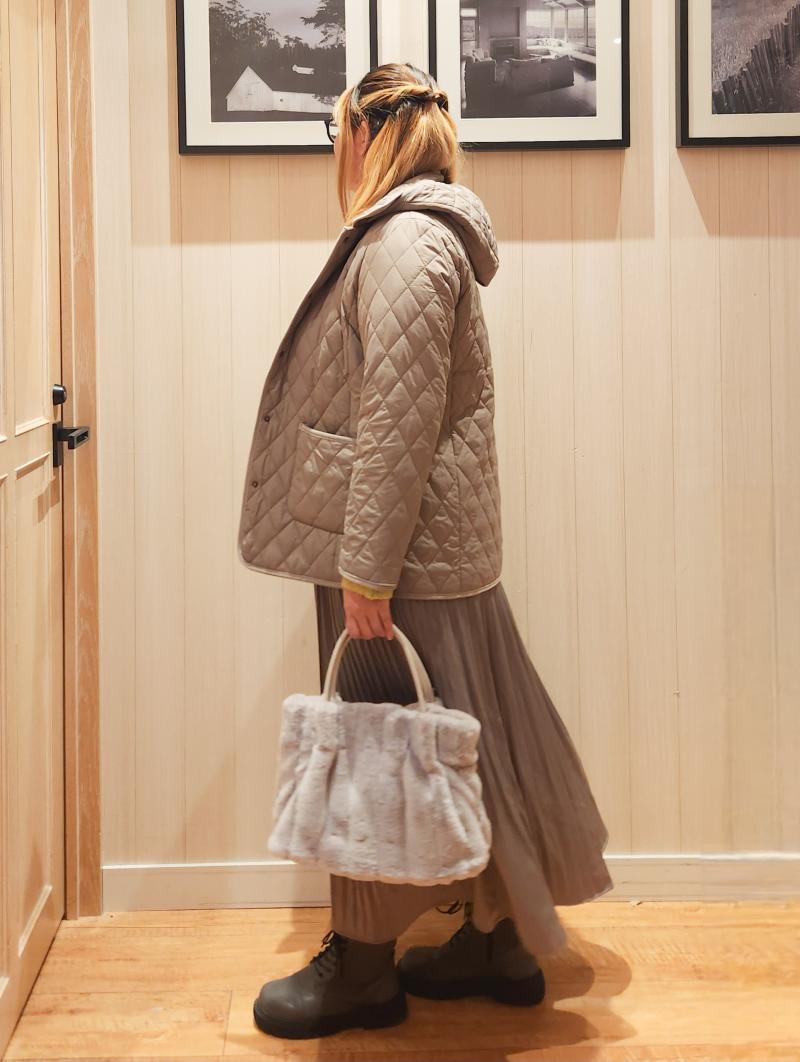 トレンドのキルトジャケットで今っぽい感じを演出し、ニット、サテンスカートで体型カバーをしました。