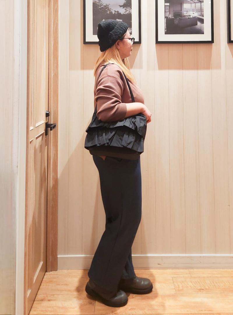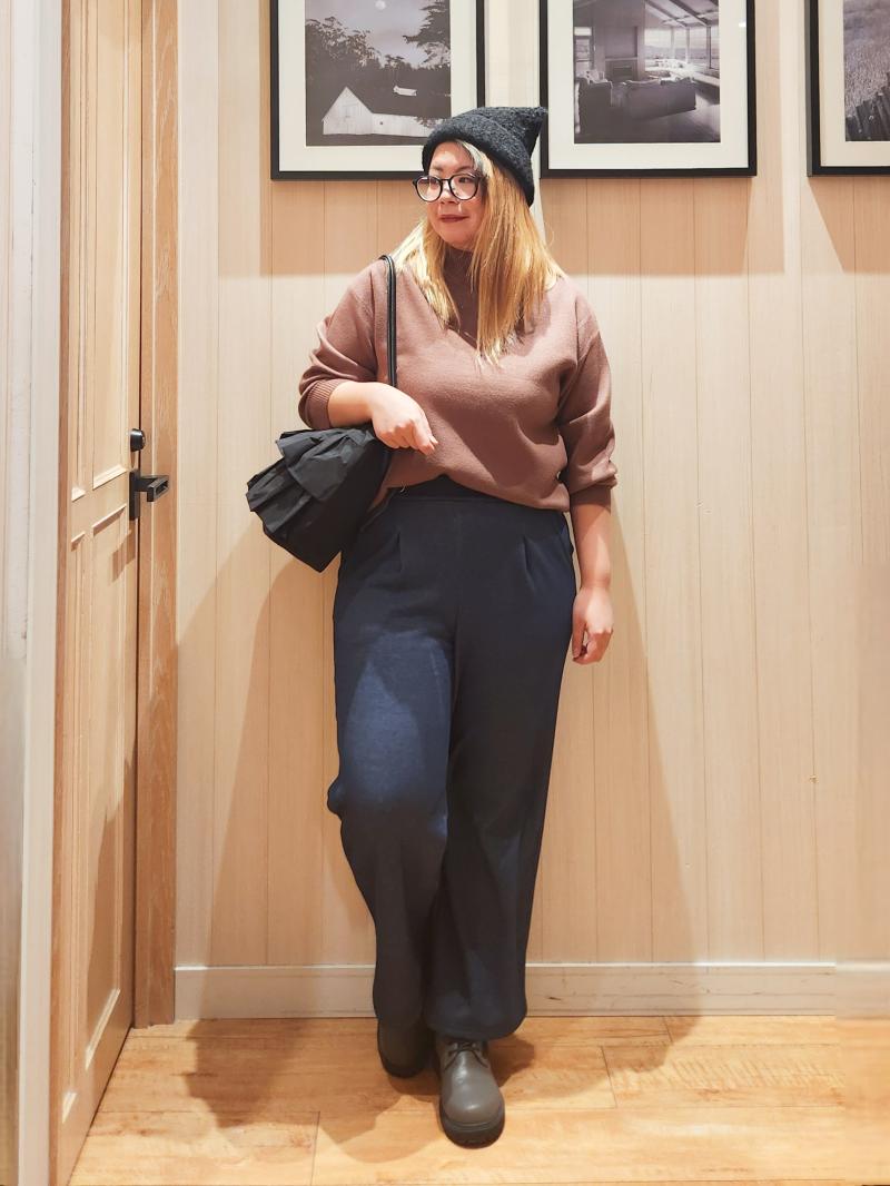 ボトム、ブーツを暗めなカラーにして、視線を下半身に向きづらいようにしました。