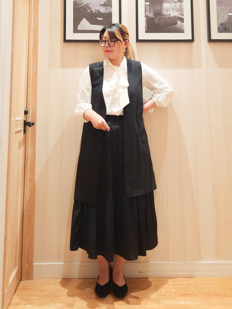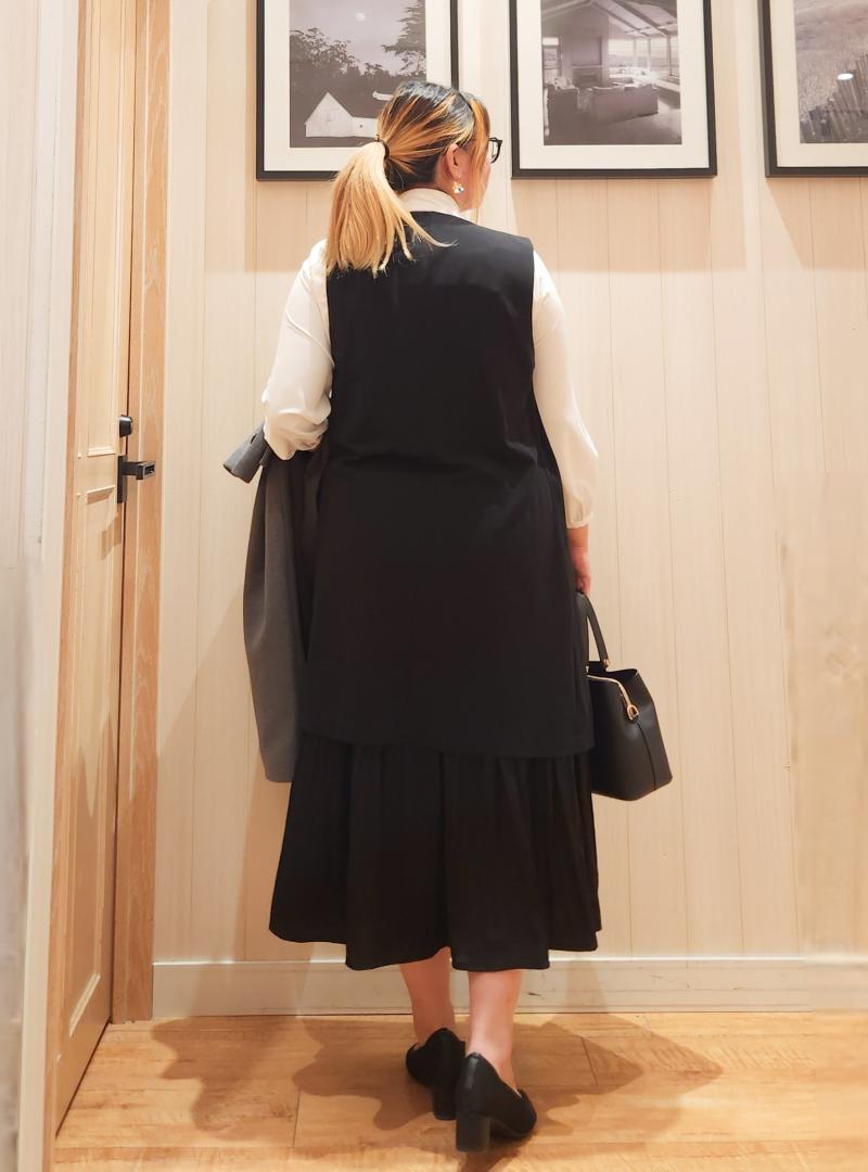 ブラウスをインして、腰の位置を高く見せスタイルアップコーデにしました。