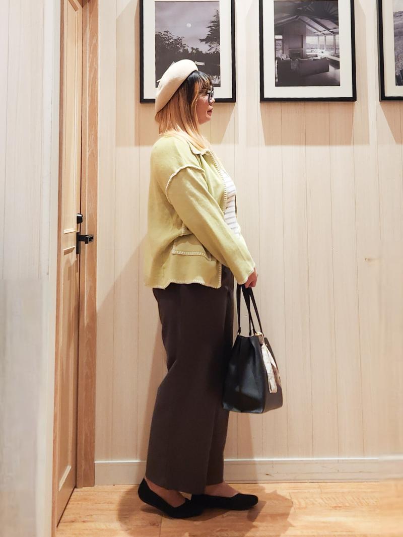 春らしい、ライトグリーンのニットがアクセント。