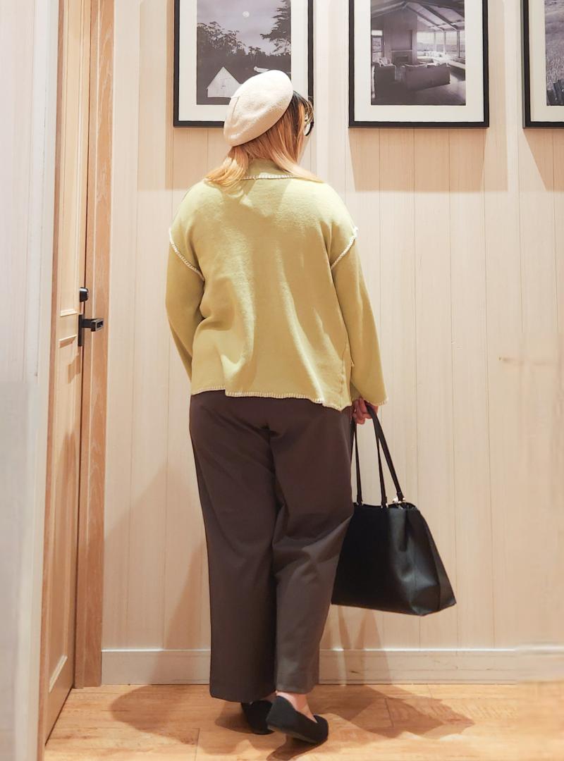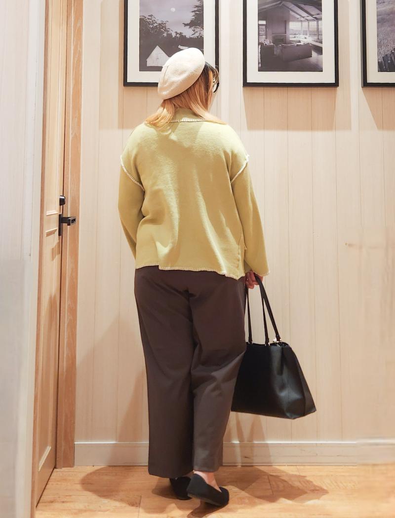 下半身は引き締めたかったので、深いブラウンのワイドパンツを使いました。