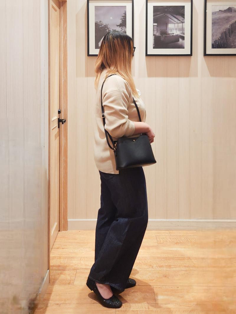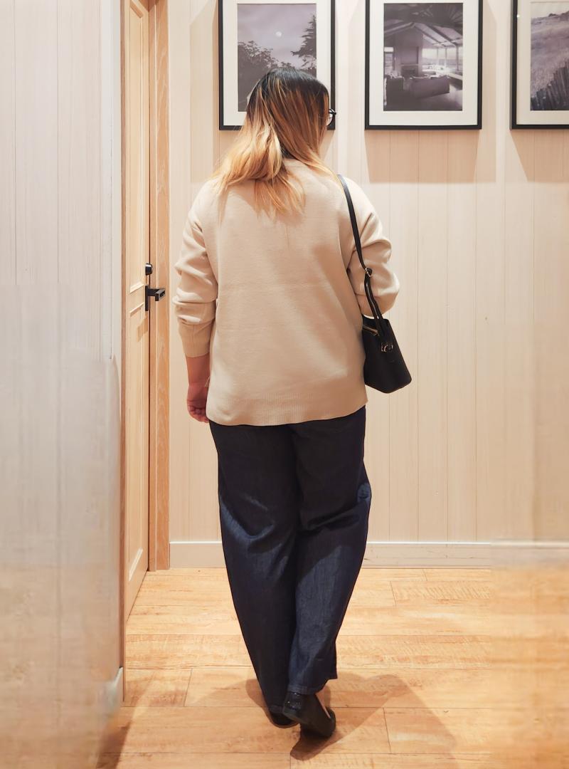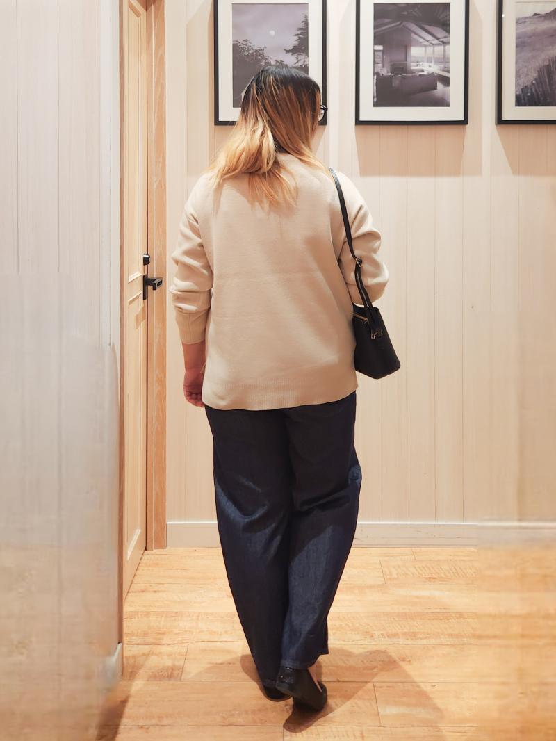 トレンドのデニムカーブパンツを使った今っぽいコーデ。