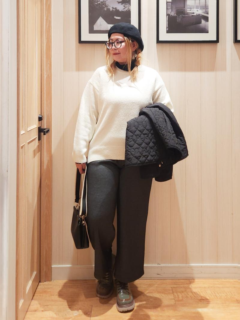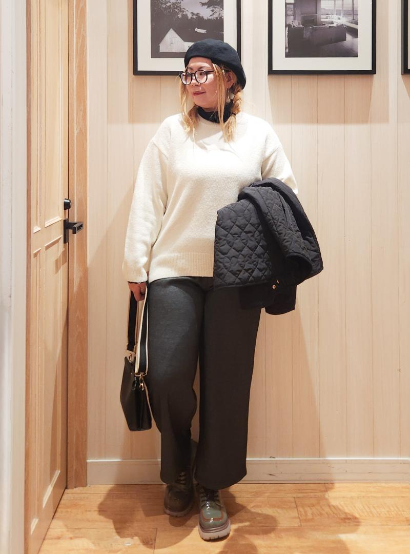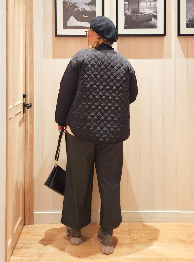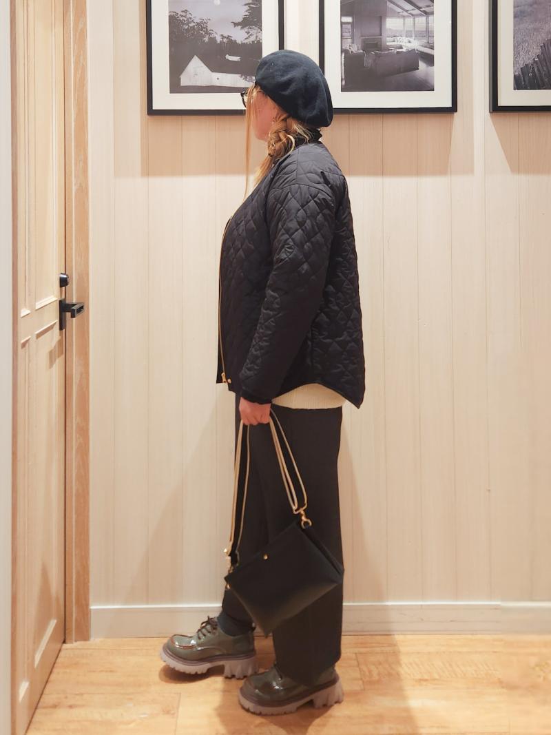 ラウンドネックなキルトジャケットなので、ニットのインナーにレース切り替えのハイネックを着用。首元からチラッと見えるレースでフェミニン感をプラス♪