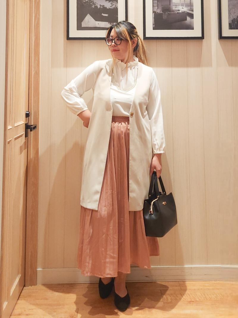 ライトベージュのジレで顔色を明るく見せて、フリルブラウスとパールネックレスで顔周りを華やかにしました。