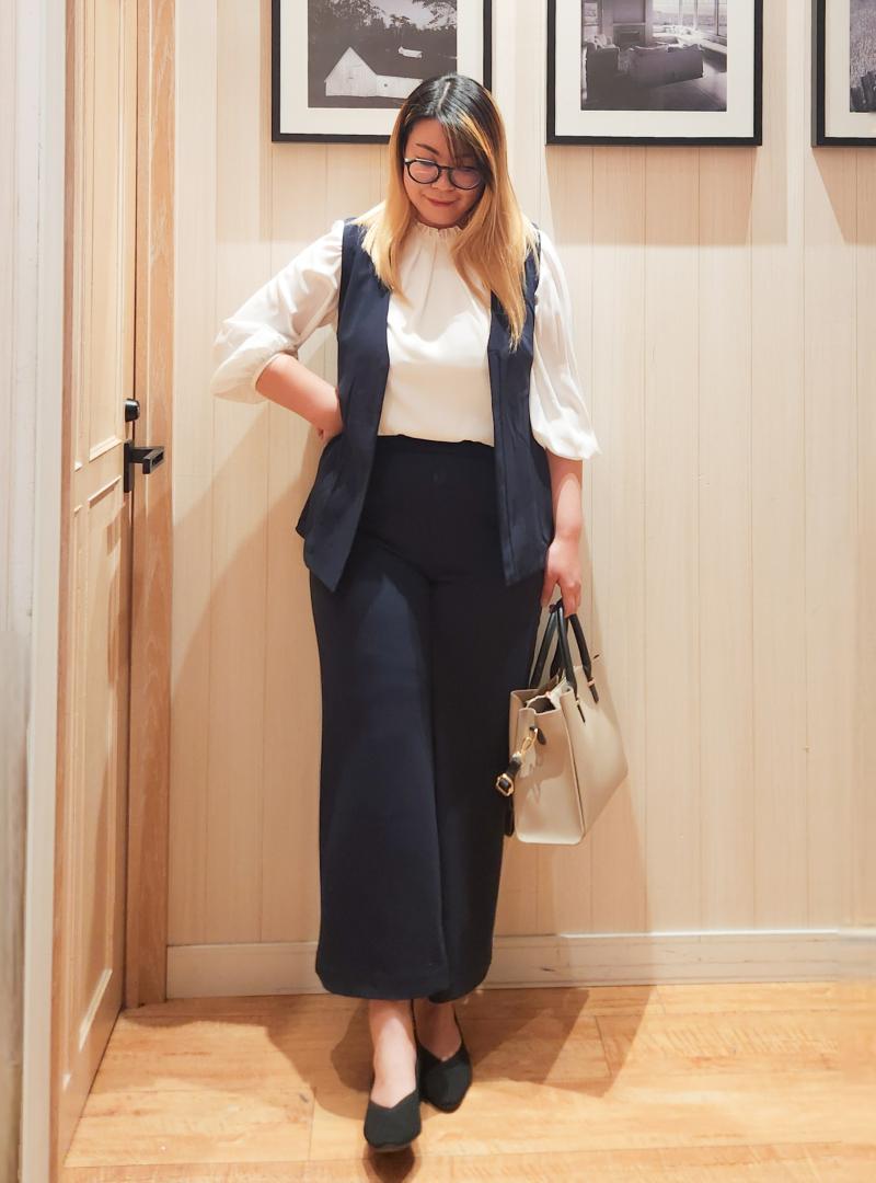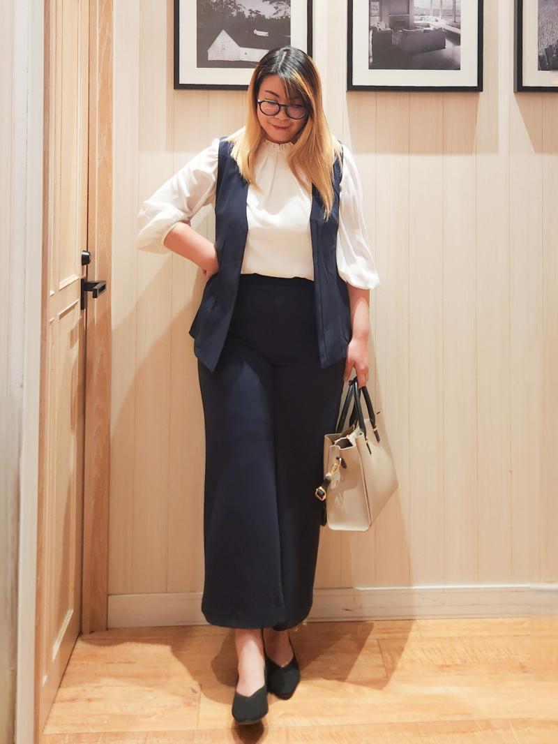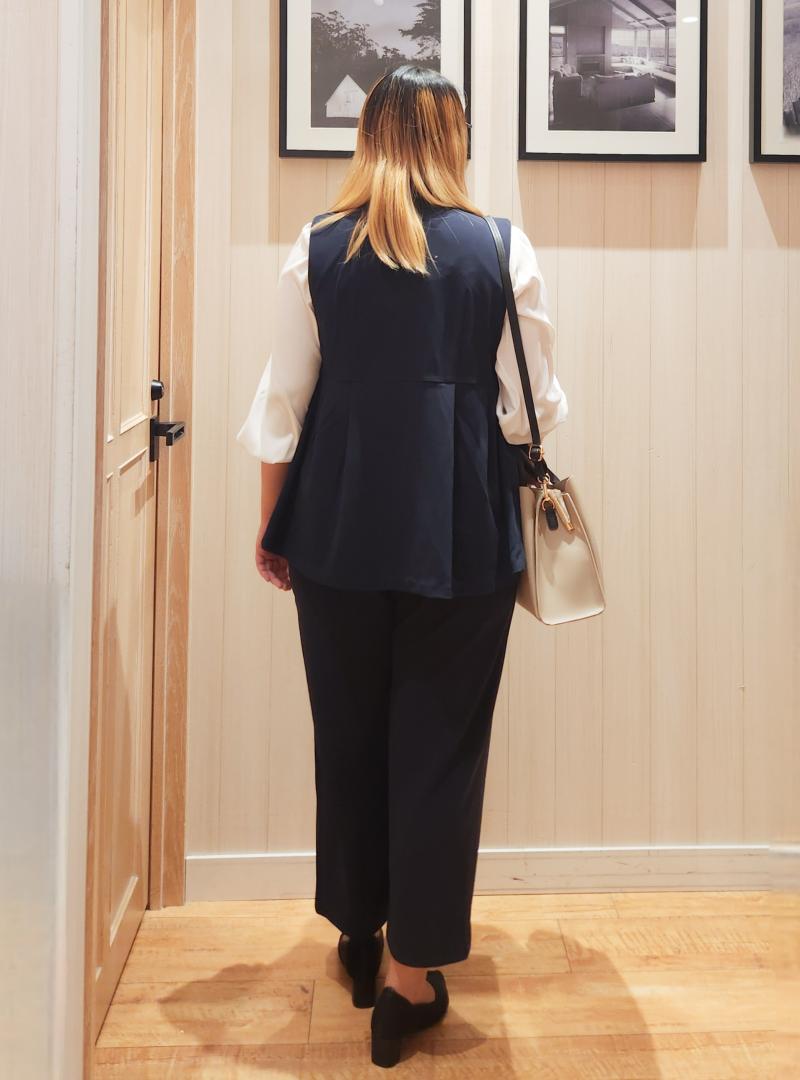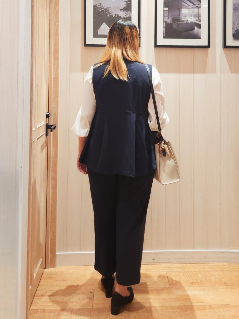 ジレで腰周りをカバーし、ワイドパンツで脚のラインをカバーしています。