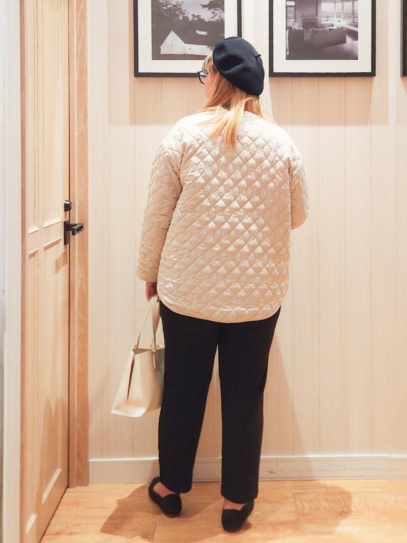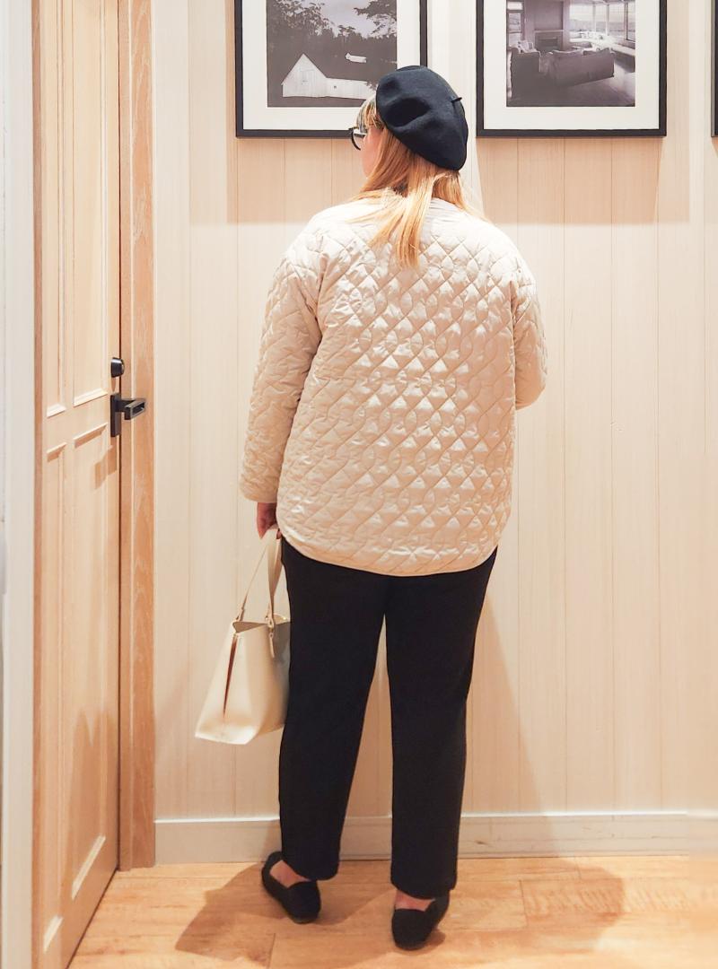 ゆったりとしたジャケットなので、ボトムはスッキリとしたテーパードパンツでシュッとして見えるようにしてます。